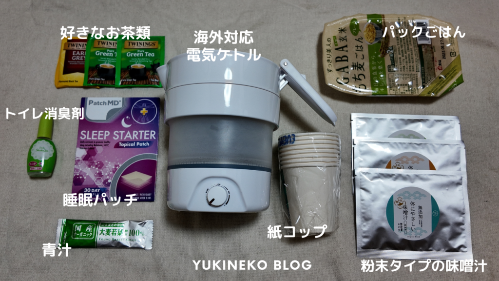 青汁やおみそ汁、玄米やいつも飲んでいるお茶など多めに持っていきました。